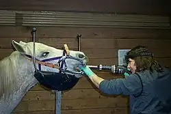 Modern equine dentistry. This horse is heavily sedated and has been given analgesics, its head is supported by a sling. The mouth is kept open with a (horse) mouth gag, commonly referred to as a "speculum".