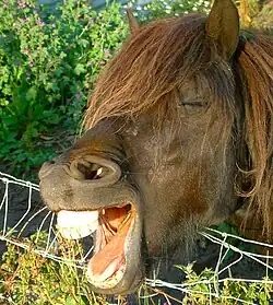 Horse teeth refers to the dentition of equine species, including horses and donkeys. Equines are both heterodontous and diphyodontous, which means that they have teeth in more than one shape (there are up to five shapes of tooth in a horse's mouth), and have two successive sets of teeth, the deciduous ("baby teeth") and permanent sets.