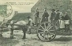 In 1819, the director of the Haras National de Langonnet commented on his difficulties in finding good stallions in the region.[88] Ephrem Houël ran the Langonnet stud from 1838 to 1847. In his Traité complet de l'élève du cheval en Bretagne (1842), he testifies to the central place this animal occupies in Breton life. Even the poorest peasants are obliged to own at least one horse.[89] Farming, public carriages, road transport and city services are all carried out by local horses.[90] Peasants go to pardons, christenings, funerals, pleasures and family affairs on horseback. According to Houël, riding is especially de rigueur at weddings.[89] In the mountainous regions of inland Brittany, where roads are poor, the use of packhorses remains important.[91] In the middle of the century, Jean-François Brousmiche testifies to the care these farmers lavished on their horses: it was not uncommon for them to be sheltered in the house in winter. They prepared the animals' feed "with as much or even more care than their own".[92] Horse-drawn vehicle was often harsh. Some horses die between their harnesses. In the hills, stagecoach passengers dismount to relieve the animals. Animals pulling as far as Saint-Brieuc are sometimes "doped" with Calvados.[93]