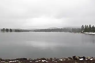 Horseshoe Cienega Lake sits at 8,100 feet (2,500 m) on the Fort Apache Indian Reservation. The lake turnoff is approximately 20 miles (32 km) from Pinetop-Lakeside in the west and approximately 25 miles (40 km) from Eagar to the east. The main parking area and boat launch are about a mile (1.6 km) south of State Route 260, and are accessed by a well-maintained dirt road. Unlike many of the high-altitude White Mountain lakes, Horseshoe Cienega Lake is accessible year-round. Ice fishing is possible when the lake freezes over, typically from late-November until mid-April.[2] The average high temperature at the lake in January is 42 °F (6 °C) compared to an average high of 75 °F (24 °C) in July while the average low temperature in January is 7 °F (−14 °C) compared to average low of 44 °F (7 °C) in July.