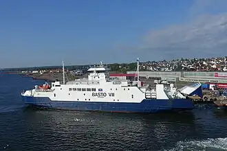 Being located out on a peninsula, most major transportation arteries go to the west of Horten, and secondary roads connect the city to these routes. The Moss–Horten Ferry (also known as the Bastø Ferry) crosses the Oslofjord, connecting to the town of Moss in Østfold count. The ferry departs 1–4 times per hour, and the journey takes about 30 minutes. The ferry transports about 1.8 million vehicles and 3.5 million passengers each year.[4]