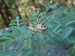 Hosackia crassifolia is a long-lived, somewhat bushy plant which bears long straight stems with evenly spaced oval-shaped leaves.[2]