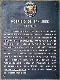 Initially named the Hospicio General (General Hospice), Hospicio de San José was established during the Spanish Era in October 1778 by Francisco Gómez Enríquez and his wife Barbara Verzosa. After being cured of a fever, Gómez Enríquez donated the sum of ₱ 4,000 to found the hospice that would take care of Manila’s “poor and unwanted children”, the physically and mentally disabled, and aging people. The initiative and example of Gómez Enríquez was followed by other charitable people of Manila.[1]