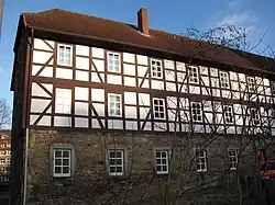 The Hospital of the Five Wounds is one of the largest half-timbered houses in Hildesheim. The address is Godehardsplatz 9–11 which is a large square in front of the Romanesque St. Godehard, but actually it is in a small and rather steep side lane. The building has four floors and a half-hip roof.