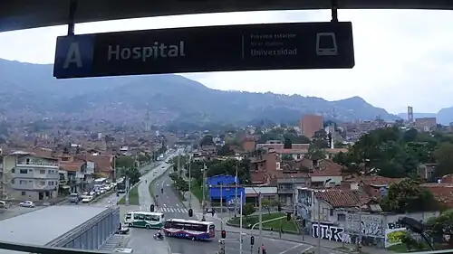 Hospital station is the eighth stop on line A of the Medellín Metro.[1] It is located in the central eastern part of Medellín and stops at complex that can connect to the University Hospital of San Vicente de Paúl, for which it is named. The station was opened on 30 November 1995 as part of the inaugural section of Line A, from Niquía to Poblado.[2]