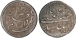 Ali Mirza's realm included the three main mints of Iran: Yazd, Kerman, and Shiraz. His coins are mostly follis, and gold coins were rare due to a shortage of material.[33] The reverse states that the coin was minted in Shiraz.[34] Other coins engraved his name as Hossein Ali Shah on the reverse and titled him as Sultan of Sultans. This differs from the coins of his father, Fath-Ali Shah, who had used the title of Shahanshah.[33][35]