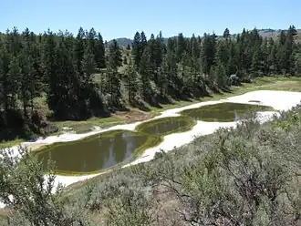 Hot Lake is a hypersaline, meromictic lake located in extreme northern Okanogan County, Washington near Oroville, Washington.[2] Occupying a small, glacially-carved basin surrounded by mafic magnesian rocks, dolomites, and shales containing deposits of pyrite and pyrrhotite minerals, Hot Lake is unusual among hypersaline lakes in that it is dominated by magnesium and sulfate as its major ions.[3] Because of its mineralogy, Hot Lake was mined for epsomite, initially by the Stewart-Calvert Company during World War I, when the importation of epsomite from Germany was suspended.[4] Major flora growing within the lake include Ruppia maritima[5] and Chara, and the dominant fauna are the brine shrimp Artemia salina and Branchinecta campestris.[2] A benthic phototrophic microbial mat dominated by cyanobacteria is also found within the lake.[2]