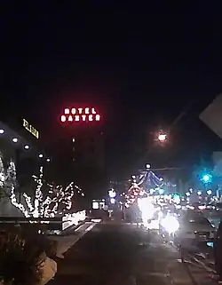 The Hotel Baxter, popularly called the Baxter or Baxter Hotel, is a seven-story hotel built in 1929 in the Main Street historic district of Bozeman, Montana. Designed in Art Deco style by architect Fred F. Willson, it opened for business on March 2, 1929. The grand opening party was held Saturday, March 16, 1929.[2] The hotel is named after George Baxter, a prominent Gallatin County rancher who provided much of the funding.[3] It originally contained 76 rooms,[2] two bars, and restaurant facilities. An ornate lobby on the main floor includes a small water fountain. The mezzanine level features a large ballroom. Its upper floors today contain about 20 condominium-style residences,[2] mostly one and two-bedroom apartments.[4] Ted's Montana Grill and the Bacchus Pub are on the ground floor.[5]