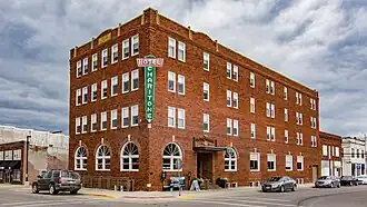 A Hy-Vee Market Grill opened in May 2014, and the upper floors house 12 apartments. The four-story brick structure features three arched windows on the first floor of the west, and two that flank the main entrance on the south elevation. A third window on this side of the building had been converted into a doorway into the hotel's restaurant by 1935.[2] A brick parapet with stone trim caps the structure, and decorative brickwork descends from the cornice on the corners. A neon sign was added in the 1930s. The building was individually listed on the National Register of Historic Places in 2006.[1] In 2014 it was included as a contributing property in the Lucas County Courthouse Square Historic District.[4]