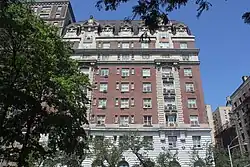 The design of the base along 103rd Street is similar to on Broadway, except that the ground slopes up from east to west, and there is a recessed areaway in front of the ground story.[16] There is an iron fence in front of the areaway, which was replaced at some point in the 20th century.[17] The original main entrance to the building is in the central bay on 103rd Street, on the second story,[16] through an arch measuring 15 feet (4.6 m) tall.[18] The entrance is flanked by Tuscan-style fluted columns with bands, and there is an ornate entablature above the columns. In addition, a cartouche with mask and swag motifs is placed above the entrance. The bays directly next to the entrance are arched and contain rectangular panes with an oculus above them. On the third through seventh stories, the window in the central bay is flanked by slit windows. The upper stories are similar in design to the Broadway facade.[16]