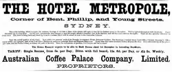 - ^ "Hotel Metropole, Bent, Phillip, and Young Streets, Sydney". The Sydney Mail and New South Wales Advertiser. New South Wales, Australia. 24 October 1896. p. 855. Retrieved 22 July 2023 – via National Library of Australia.