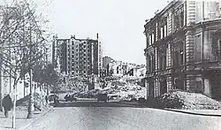 After Kyiv's liberation, during the cleanup of the streets and squares of the city from the ruins the remaining part of the Ginzburg house were pulled down. Symbolically on the 22nd of June, 1944 the City Council called for a competition for architects from Kyiv as well as other places from the republic and the union to develop a new project for a complete reconstruction of the central city. Most of them had provisions to place a new tall building on the place of the original Ginzburg house. The 1937 opinion of Alexander Dovzhenko about the Ginzburg house that all likewise constructions of Kyiv should be based on its geographical relief, was echoed in almost every project.