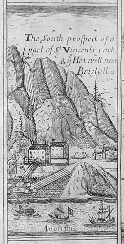 Hotwells takes its name from the hot springs which bubble up through the rocks of the Avon Gorge underneath the Clifton Suspension Bridge.[4] The springs were documented in 1480 by William Worcester, the 15th century chronicler and antiquary. He described the waters as being milky and as warm as those at Bath.[5][6] By c.1630 the water of Hotwells was becoming known for its medical properties, both in its original form and when used to brew beer. Thomas Fuller, who had been a student of Dr Samuel Ward in the late 1620s, reported that 'beer brewed thereof is wholesome against the spleen; and Dr. Samuel Ward, afflicted with that malady, and living in Sidney College, was prescribed the constant drinking thereof, though it was costly to bring it through the Severn and narrow seas to Lynn, and thence by the river to Cambridge.'[7] In 1650 Dr Venner recommended Hotwells water for those 'who have hot livers, feeble brains, and red pimply faces' and after 1680 the water became well known as cure for diabetes.[8]