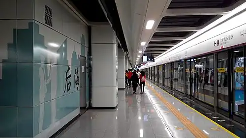 Houhai station (Chinese: 后海站; pinyin: Hòuhǎi Zhàn; Jyutping: Hau6 Hoi2 Zaam6; lit. 'Deep Bay station'), formerly Nanshan Shopping Center station (Chinese: 南山商业中心站; Chinese: 南山商業中心站; pinyin: Nán Shān Shāng Yè Zhōng Xīn Zhàn; Jyutping: Naam4 Saan1 Soeng1 Jip6 Zung1 Sam1 Zaam6), is an interchange station between Shenzhen Metro Line 2, Line 11 and Line 13. Line 2 platforms opened on 28 December 2010, Line 11 platforms opened on 28 June 2016 and Line 13 platforms opened on 28 December 2024. It is located within the Nanshan District CBD development. It serves the population coming to nearby shopping centres as well as office buildings and it is busier and more heavily used than most other Line 2 stations.