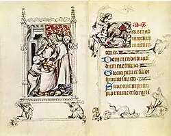 The miniatures use a variety of grisaille drawing in pen known (or at least so called in an inventory that included this work) as "de blanc et noir" and tempera for the other colours. Using both grisaille and colour together is a technique known as “camaïeu gris”. The full-page paintings include cycles of what are always the most commonly found phases of the Life of Christ, the Passion and Infancy. These illustrate the Hours of the Virgin, which is found in some other books of hours, but most unusually they are arranged on facing pages showing a scene from the Passion on the left and from the Infancy on the right, with eight pairs of scenes.[4] However such an arrangement is often found in the ivory diptychs that were being produced in great numbers in Paris at this period.[5] Another cycle shows nine scenes from the life of the Saint-King Louis IX of France decorating the office dedicated to him. Saint Louis was the great-grandfather of both Queen Jeanne and her husband Charles IV, who were first cousins.