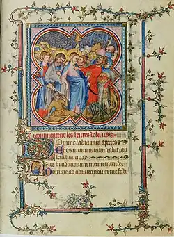 The composition The Betrayal of Christ on the Mount Olives from the Hours of Jeanne de Navarre is based on a miniature from the Hours de Jeanne d'Evreux created by Jean Pucelle which is folio 15 verso ill.[2] A trait that Le Noir picks up from Pucelle is the tiny soldier peeking out of the D initial on the page.[2]
