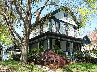 Lawrence Street is located north of downtown Wakefield, extending east from Main Street toward Vernon Street at the southern end of Lake Quannapowitt. This house stands on the north side of the westernmost block, its lot fringed by low retaining walls, with granite posts flanking the driveway entrance. The house is 2+1⁄2 stories in height, with a front-facing clipped gable roof, and an exterior finished in a combination of wooden clapboards and decorative cut shingles. It is basically rectangular in plan, with a single-story hip-roofed porch extending across the front and around part of the left side. The porch features turned posts, a decorative valance, and turned balustrades. Second floor windows are topped by shallow gables, and there is a round-arch window in the gable above. The original carriage barn stands behind the house, also exhibiting original Queen Anne styling.[2]