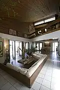 The residence was accommodated along a visual axis that stars at the lot's entrance, stretches to its tip, and connects with one of the ends of a small bay shaped by the beach. Two volumes in concrete, laid out symmetrically in relation to a diagonal axis, contain the bedrooms and the kitchen. The central space, including a living room and a family room covered with a wooden sloping roof aligned with the main view, follows the direction underlined by the organizing axis. The design included built-in furniture that maximizes the enjoyment of views towards the ocean.[4]