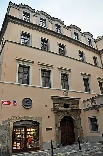 In the mid-16th century, the house was owned by Jan Kosořský z Kosoře, famous for having printed the then-largest Czech book, the Münster Cosmography (1554).[1] Writer and journalist Egon Erwin Kisch was born in the house,[3] at the house is placed a plaque with his portrait.
