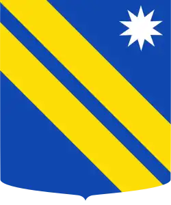 The house's coat of arms is emblazoned as "Azure, two bends Or, a mullet of ten points in sinister chief Argent". Its motto was "Spero",[1] which translates to "I hope" from Italian.
