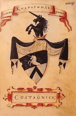 The first grant of nobility was granted in 1398 by king Stjepan Ostoja of Bosnia († 1418) while the second document was given in 1404 by Grand Duke Stjepan Vukčić Kosača († 1466) unto Prince Pavle Kostanjić and his brothers. Another confirmation was made on 7 August 1475 by Duke Vlatko Hercegović (✶ c. 1428 - † 1489), the son of Grand Duke Stjepan Vukčić Kosača, who gave permission to the House of Kostanjić to continue using Drvenik as the main estate of the family. In this document it is also mentioned that the House of Kostanjić was accepted in the “vjeru gospodsku” (Slavic: faith of the nobles)