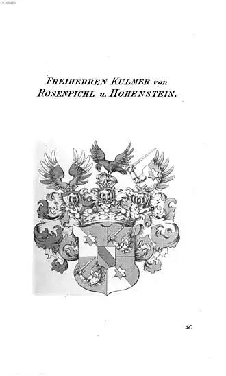The House of Kulmer is a noble family originating in the Duchy of Carinthia. The family ancestry is traced back to the 14th century under names of Kulmer and von Münzenbach. Georg Kulmer (?–1567) had the Rosenbichl Castle built near Klagenfurt, while his brother Hermann Kulmer (?–1546) built the Hohenstein Castle near Sankt Veit an der Glan. Johann Balthasar Kulmer (?–1683) was awarded the title of baron in 1654 and the title of von Rosenpichl und Hohenstein. His three sons, Georg Ferdinand (1638–1706), Christoph Andreas, and Ferdinand Ernst are deemed the progenitors of the Carinthian, Styrian and Croatian branches of the family respectively.[1]
