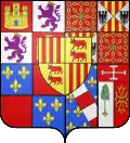 Écartelé : au I, contre-écartelé en 1 et 4, de gueules au château d'or ouvert et ajouré d'azur (de Castille), en 2 et 3 d'argent au lion de pourpre armé, lampassé et couronné d'or (de León) ; au II, écartelé en 1 et 4, de gueules aux chaînes d'or posées en orle, en croix et en sautoir, chargées en cœur d'une émeraude au naturel (de Navarre), en 2 et 3 écartelé en sautoir d'or aux quatre pals de gueules (d'Aragon) et d'argent à l'aigle de sable (Hohenstaufen) (le tout de Sicile) ; au III contre-écartelé en 1 et 4 d'azur aux trois fleurs de lys d'or et en 2 et 3 de gueules (d'Albret) ; au IV parti en a, d'azur semé de fleurs de lys d'or à la bande componée d'argent et de gueules (d'Évreux), en b, parti d'argent à un noyer arraché de sinople et de gueules, à la croix d'or, alaisée, vidée, cléchée et pommetée de douze pièces ; au chef de gueules chargé d'une croix potencée d'argent (de Nogaret) ; sur-le-tout, écartelé en 1 et 4 d'or aux trois pals de gueules (de Foix) en 2 et 3 d'or aux deux vaches de gueules, accornées, colletées et clarinées d'azur, passant l'une sur l'autre (de Béarn).[7]