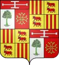 Écartelé : aux I et IV, parti : au 1, d'argent à un noyer de sinople (de Nogaret), de gueules à la croix de Toulouse d'or (de L'Isle-Jourdain), à un chef de gueules chargé d'une croix potencée d'argent sur le tout ; aux II et III, contre écartelé : aux 1 et 4, d'or, à trois pals de gueules (de Foix), aux 2 et 3, d'or à deux vaches passantes de gueules, l'une sur l'autre, accornées, colletées et clarinées d'azur (de Béarn).[9]