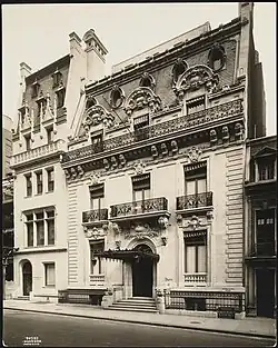 Before 1870, Thurn sold imported children's clothing from a small storefront in Brooklyn.[38] In that year, it opened its first shop in Manhattan at 50 East 10th Street near Broadway.[6] By 1873, it had moved further north to 884 Broadway.[7] By 1881, it had obtained its first Fifth Avenue address, at storefront at number 288, close to the corner of Fifth and 29th Street (see Image No. 13, above).[9] A few years later, Sidonie, who had previously held property jointly with her husband, bought him out to become sole owner.[39] In 1888, Thurn opened a shop for the summer season in Newport, Rhode Island and continued in business there through the first decade of the twentieth century.[40][41] In 1889 or 1890, Thurn again moved uptown in Manhattan, this time to 426 Fifth Avenue (see Image No. 14, above).[10] In 1913, Thurn made its final move, opening in a mansion at 15 East 52nd Street owned by the man who named and then promoted Ivory Soap as "99 and 44/100 percent pure" (see Images No. 15 and 16, above).[42] In announcing the lease, a writer for the Real Estate Record and Guide said, "the dwelling, built about eight years ago from plans by Donn Barber, is one of the finest in the city, all of the marble, woodwork, and decorations having been purchased abroad. Extensive alterations are to be made to the upper part of the building, but the main floor will be left as it is. The lease is for 21 years at an aggregate rental of $500,000."[31] In 1922, a writer described Thurn as a stately establishment having "high-studded marble rooms" for "the exquisitely ordered display of women's and young girls' frocks, cloaks and hats, and of their filmy dessous and negligées as well."[43]
