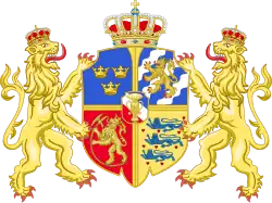 From 1222 to 1275, carried the arms of the Kings of Denmark.[7] Arms of 1275 to 1319 : D'azur, à trois barres ondées d'argent, au lion couronné d'or armé et lampassé de gueules, brochant sur le tout (King Magnus III of Sweden used the arms of his father - Birger Jarl - with a crown added to the lion[7]). Arms from 1319 to 1363 : D'azur à trois couronnes d'or posées 2 et 1. |