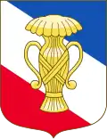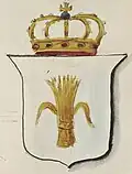Tranché d'azur et de gueules à la banche d'argent et à la gerbe d'or brochant sur le tout.[7]