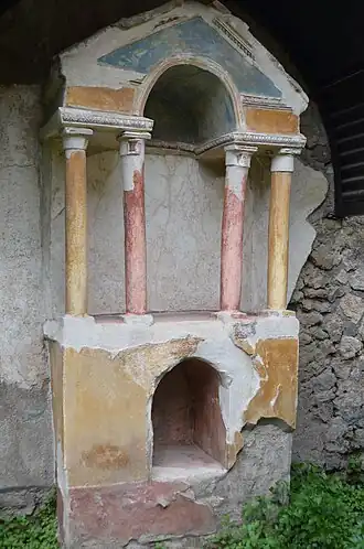 This corridor-like room, only 34 inches wide by about 6 1/2 feet deep, is thought to have contained a cabinet for herbs or medicinal compounds. It has the same floor pavement as the porticus and appears to have been intentionally created when the exedra (summer triclinium) was constructed within the south side of the porticus. Its walls were painted white with dividing stripes in red and ocher above a black socle. On the east wall is a twisted candelabra overlapped by a red filigree border and fragments of a red ornamental ribbon, green leaf garland with red fruits and a green lion-griffin springing to the left. There is a small window placed in line of sight of the lararium in the garden.[28]