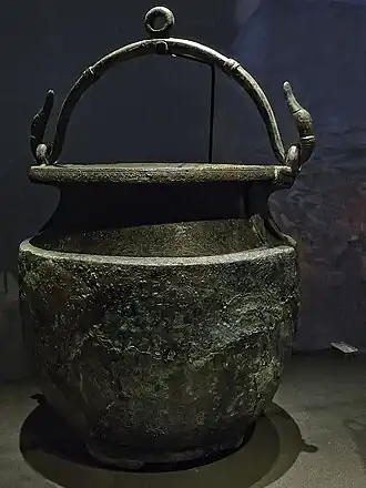 In the atrium, excavators found a bronze basin with two handles terminating in the form of the heads of geese, another wide-mouthed bronze basin with two movable handles, a bronze bucket with a movable handle, a circular box with a hinged lid, a bronze fibula, a saucepan with protruding lip and circular handle, another large bucket with movable handle terminating in upturned goose heads with a fixed ring for hanging in the center, and two inscribed terracotta amphora.[10] A large bronze bucket of this type was most often used to mix wine with water in the kitchen area before serving. It was then transferred to a pitcher for pouring the watered wine into a cup or glass.
