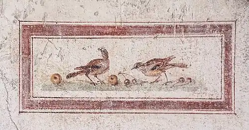 On the north wall of the triclinium, two fanciful aedicula with peacocks flank a framed panel painting of Perseus and Andromeda. Perseus, on the left, is heroically nude and grips the head of Medusa above the couple's heads so it reflects in a pool of water so Andromeda can look upon it safely.[25]