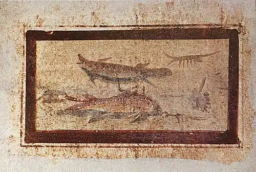 In the upper zone of the east wall were three rectangular pinakes that have been completely destroyed although the original excavator Mau described the center one that was still intact at that time. He describes a night landscape with a partially covered bridge over a river with two barks with oarsmen. Two other men on the bridge appear to be helping the barks to land.