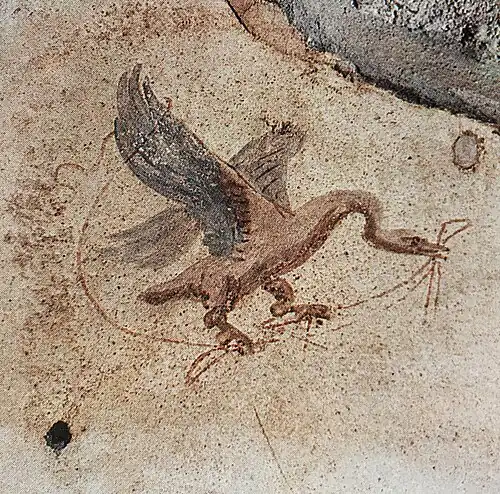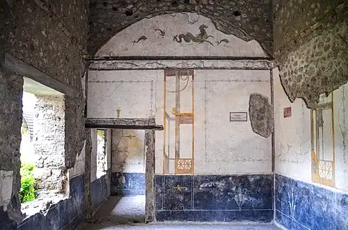 German archaeologists detected plaster edges of lost wooden door panels that could close the doorway between the tablinum and this cubiculum. Similar to the tablinum, this space has a black socle divided into panels with broadleafed green plants accented by yellow flower ornaments under the pilaster strips. The main zone is white divided into panels by dark red stripes. Panels are further detailed with filigree borders and floating emblems of opposing griffins, flying swans with heads turned back, dolphins, and jumping bucks. In the lunette of the alcove there is an outline of a peacock facing to the right and two round fruits.[22]