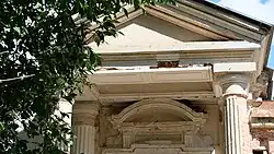 The house down the street of Schmidt, 10 in Taganrog, represents a one-story structure with the semi-basement room. It was constructed in the style of early classicism. The pediment has the triangular shape, as envisioned by the architect it is supported by 2 columns and 2 semi-columns which are created in the simplified Ionic-Corinthian style. On a trunk of a column vertical trenches – flutes are made. The entrance door is decorated with eaves of the small size with a beam pediment. Registration of a facade could be divided into three parts conditionally earlier. The central part is allocated with semi-columns with the molding located from above. Side parts of a facade of the building are framed with paired semi-columns and rectangular windows. The semi-basement floor contains windows and niches. After a reorganization of the building, some architectural details and elements were lost.[3]