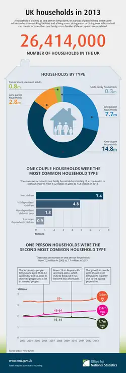 For statistical purposes in the United Kingdom, a household is defined as "one person or a group of people who have the accommodation as their only or main residence and for a group, either share at least one meal a day or share the living accommodation, that is, a living room or sitting room".[3] The introduction of legislation to control houses of multiple occupations in the UK Housing Act (2004)[4] required a tighter definition of a single household. People can be considered a household if they are related: full- or half-blood, foster, step-parent/child, in-laws (and equivalent for unmarried couples), a married couple or unmarried but "living as ..." (same- or different-sex couples).[5]