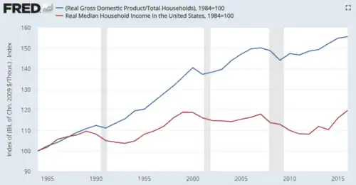 The Great Recession began with the bursting of the 2000s United States housing bubble, which led to the subprime mortgage crisis. This in turn triggered the 2008 financial crisis. In constant price, 2011 American median household income was 1.13% lower than what it was in 1989. This corresponds to a 0.05% annual decrease over a 22-year period.[29] In the meantime, GDP per capita has increased by 33.8% or 1.33% annually.[30]