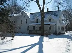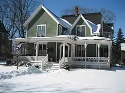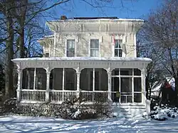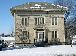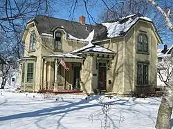 The Dr. Olin H. Smith House is located in the 800 block of Somonauk Street in Sycamore. The house was constructed between 1870 and 1877 for Dr. Olin H. Smith.[2][5] Smith, who was the town's first dentist, was raised in Sycamore and attended Sycamore schools before going to medical school in Philadelphia. He was born October 15, 1856, in St. Johnsbury, Vermont, the youngest of six children of Martha L. and James M. Smith. On arriving in Sycamore in 1857, the family first settled in a simple farm house on what is now the 800 block of Somonauk Street, before constructing the present house. In 1900 he was elected mayor, a time during which he worked to bring more industry to the city. Dr. Smith died in Sycamore on August 5, 1939. His wife, Lillian Babcock Smith, and daughter Rose Smith Mussell, continued to live in the house until their deaths in 1947 and 1950, respectively. In 1950 the house was sold out of the family.[5]