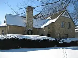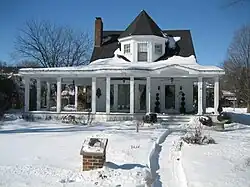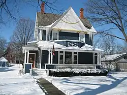 The Charles Kellum House was constructed in 1858 by Charles Kellum. Kellum came to Sycamore in 1855 as an attorney and eventually served in several public offices, including state's attorney and circuit court judge.[5] The house was once a larger structure than it is today. The building at 123 Lincoln Street, directly behind the Kellum House, was separated from the main house, in the 600 block of Somonauk Street, in the 1920s. The house's owner at the time had a daughter who was getting married and he presented the separated wing as a wedding present for the couple.[5] The roof is multiple gabled and features the distinctive Jerkin style roof. Each of the home's gables contain the element, which is a mesh of the gable and hipped roof.