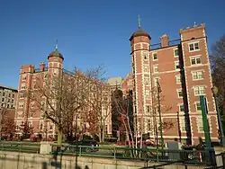 McCormick Hall,[46] located at 320 Memorial Drive, is a women-only dormitory housing 237 undergrads. It consists of two 8-floor towers (the east tower and the west tower) and an annex converted from two adjacent brownstone buildings. The three sections are connected on the ground floor. Each tower has a penthouse on the top floor that looks out on the Boston skyline. The east tower has only singles while the west tower has singles, doubles, and triples. The funds for building McCormick Hall came from Katharine Dexter McCormick (SB 1904, Biology), a leading biologist, suffragist, and philanthropist in the early twentieth century.[47] McCormick Hall was designed to advocate and encourage female participation in the field of STEM, supporting gender equality in the former US educational system.[48]