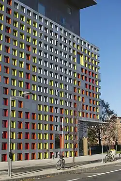 Simmons Hall[69] located at 229 Vassar Street, was designed by architect Steven Holl and dedicated in 2002.[70] At the cost of $78.5 million, it is MIT's most expensive dormitory built on campus since Baker House.