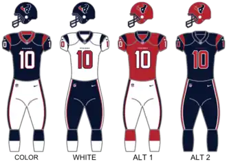 - ^ Sidhu, Deepi (August 1, 2019). "Texans Top 100: Unveiling the Texans uniform". HoustonTexans.com. NFL Enterprises, LLC. Archived from the original on September 4, 2019. Retrieved September 4, 2019.
