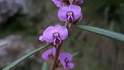 Hovea longifolia, commonly known as rusty pods,[2] is a flowering plant in the family Fabaceae, endemic to eastern Australia. It has purple pea flowers, linear leaves with rusty felt like hairs on the lower surface.