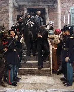 Hovenden succeeded Thomas Eakins as professor of painting at the Pennsylvania Academy of the Fine Arts in 1886.[43] He specialized in genre scenes of rural life, using his neighbors, often African Americans, as models.[26] He converted Abolition Hall into his studio,[3] and the moral causes that had been championed there inspired some of his works.[44] One of his most famous paintings – The Last Moments of John Brown (1882–1884), Metropolitan Museum of Art – depicts the radical abolitionist John Brown kissing a baby as he is led to the gallows. Hovenden was elected an associate member of the National Academy of Design in 1881, and an academician in 1882.[43]