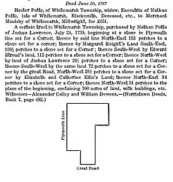 1. ^ The seller was Hester Potts, widow of Nathan Potts, who had purchased the farm from Joshua Lawrence on July 24, 1739.[8]