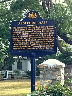 50. ^ "Abolition Hall (Thomas Hovenden) Historical Marker," from Explore PA History. NOTE: The article gets some of the dates wrong, and mistakes the barn for the carriage house.