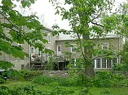 Sometime around 1795, Samuel Maulsby built a three-story, fourteen-room, Federal-style dwelling on the corner, diagonally opposite the meetinghouse.[3] He seems to have incorporated an earlier stone house into his new house.[d] He built the stone barn, perhaps around the same time,[15] and is presumed to have built the carriage shed.[3] In 1799, he married Susanna Thomas (1780–1818),[10] and they had seven children.[16]