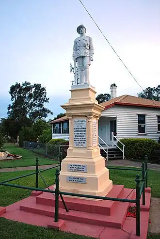 The Howard War Memorial was unveiled by Colin Rankin on 17 December 1921. Unusually for an Australian war memorial, the statue was made in Italy and depicts a soldier in Italian uniform.[30]